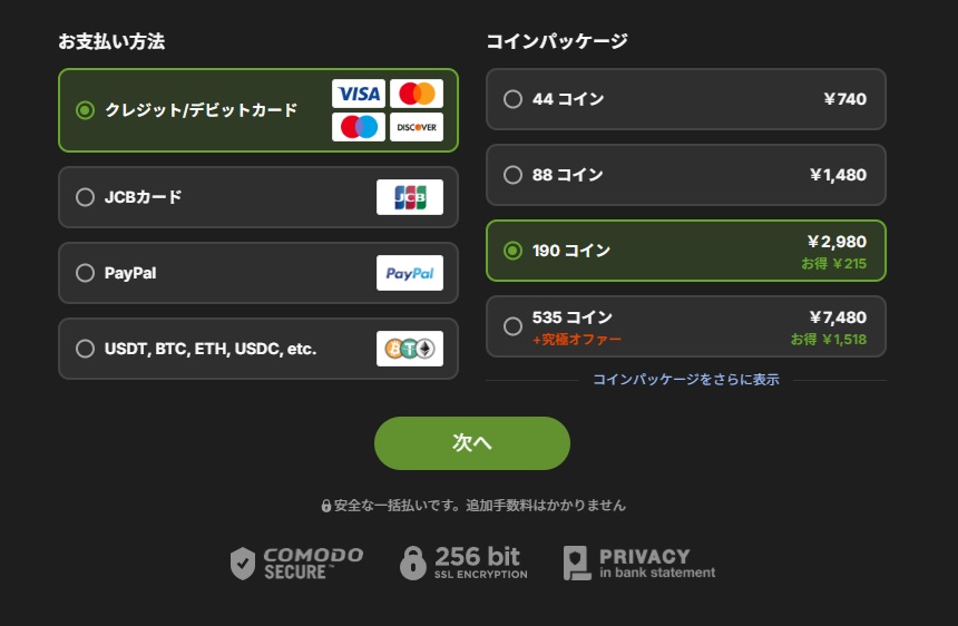 1コイン=16.8円(1ドル=152.71 円の場合)
