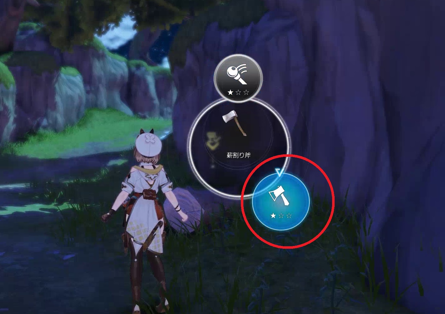 そして装備を薪割り斧に変えます。「R」ボタンを長押しします。